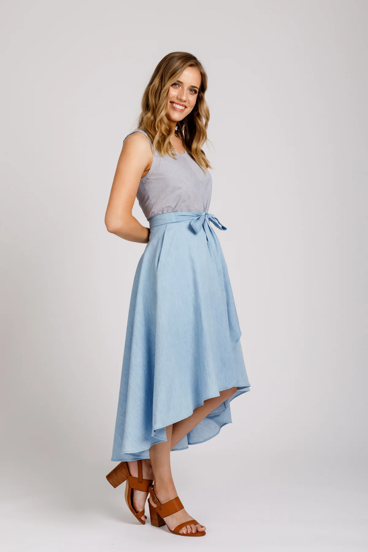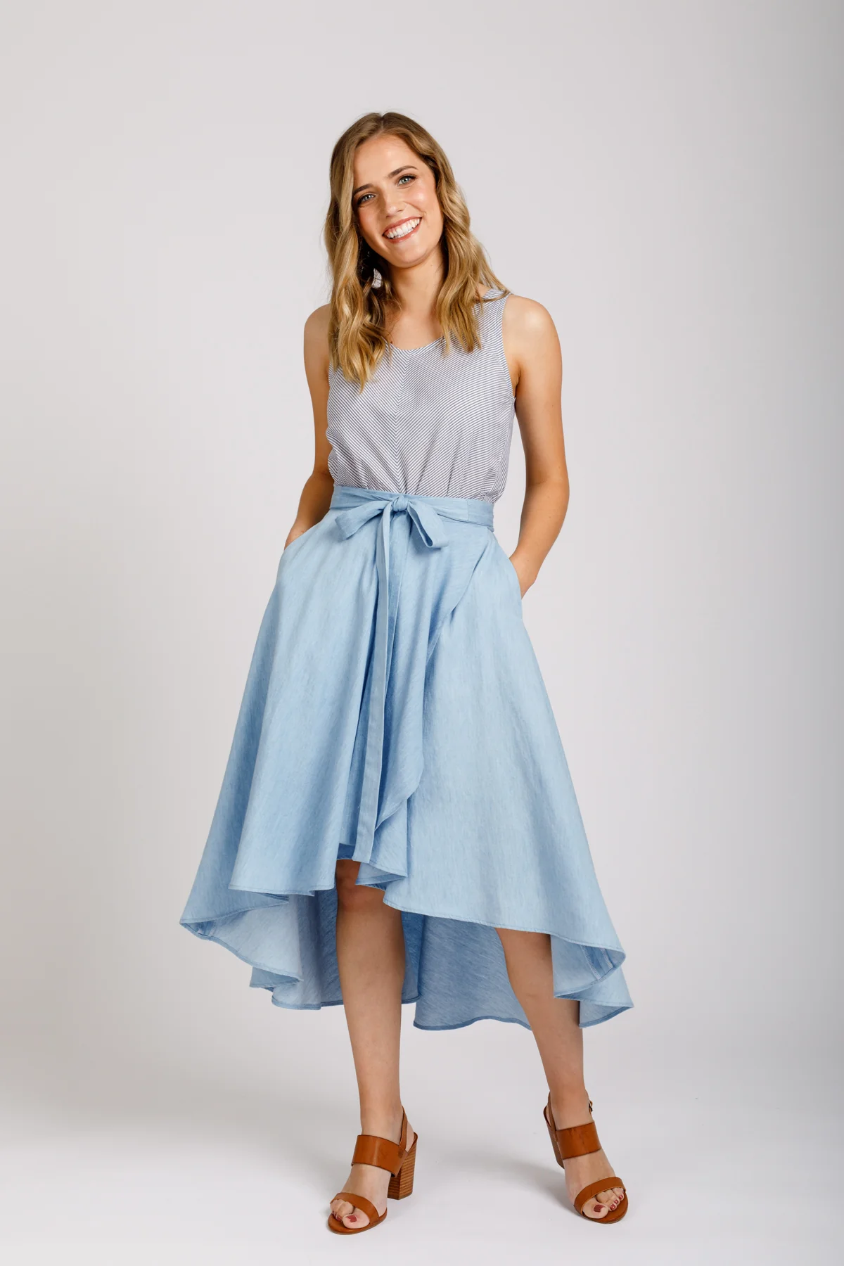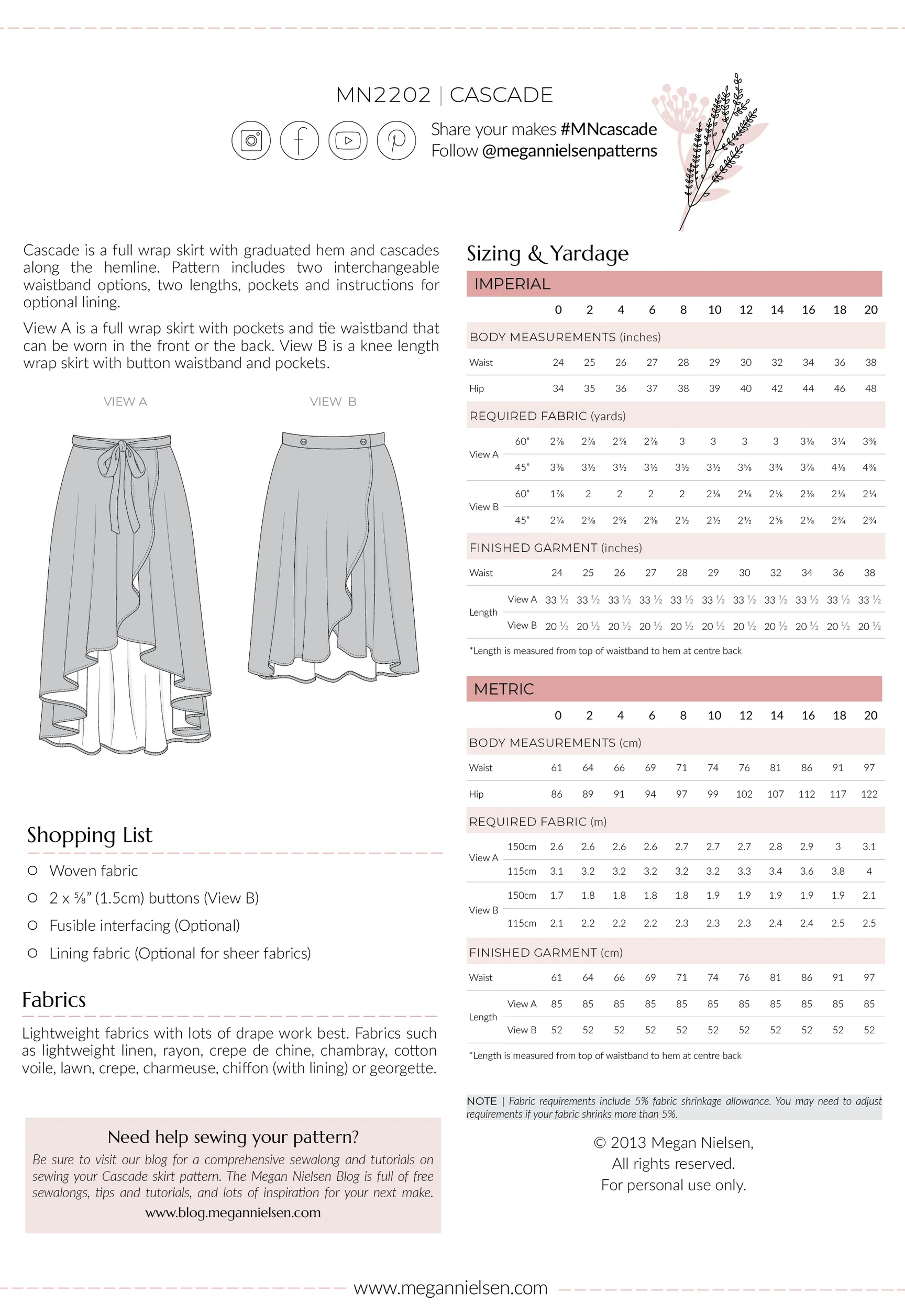Join Jordan Martindell and make this versatile wrap skirt! The Cascade Skirt from Megan Nielsen Patterns is the perfect beginner friendly skirt with a high-low hem and inset pockets. Students in this class will be making Version A of this skirt that comes in sizes 0-34. The pattern is included in the cost of this class, Materials are not included. Students will want to choose a fabric with a lovely drape: rayon, linen, crepe de chine, chambray, cotton voile, lawn, and batiste are all great options. Students may pick up their pattern from the shop a week before class and may purchase materials at the shop with a 15% discount. Students need to prewash their fabrics and have all of their pattern pieces and fabrics cut out before coming to class. Prerequisites for this class are our beginning sewing series (including garment sewing part I and II), Sewing School, or the equivalent knowledge thereof. Students should be comfortable working with a sewing pattern to take this class.